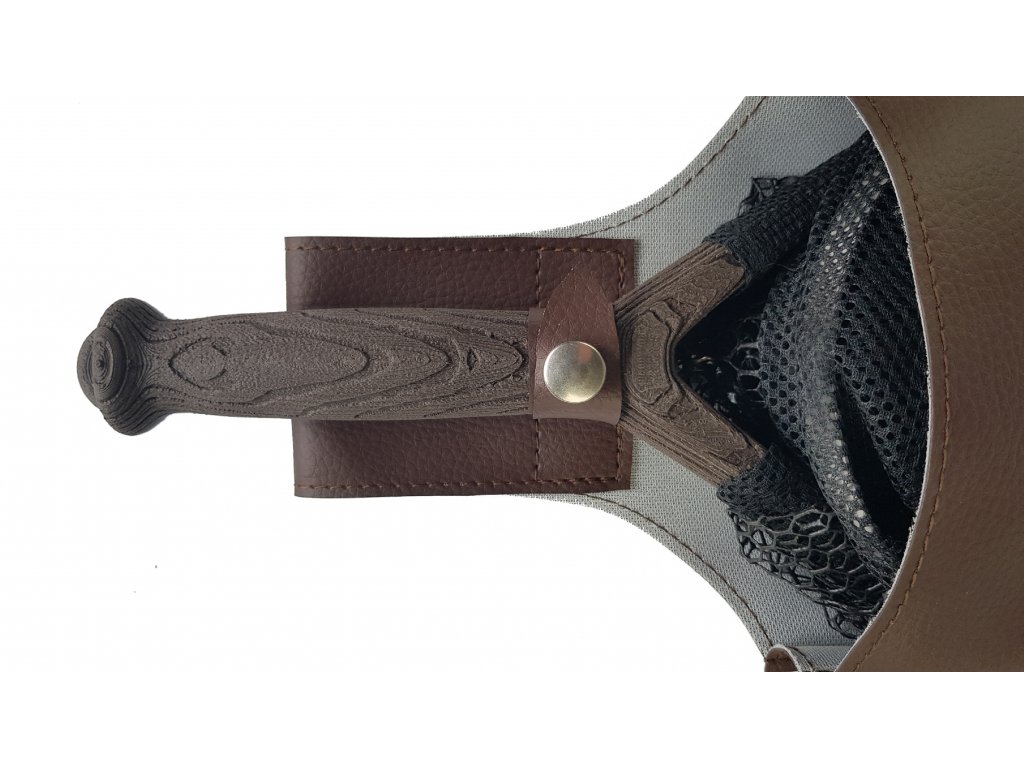 Rukojeť skládacího podběráku je vyrobena z recyklovatelného velmi lehkého materiálu, který je ergonomicky tvarovaný pro to nejpohodlnější uchycení rukou. Povrh neklouže i při úplném namočení vodou. Držátko skládacího podběráku je možné také na objednávku opatřit jménem či jinou úpravou dle domluvy. Konec držátka je opatřen očkem pro případné zavěšení.
